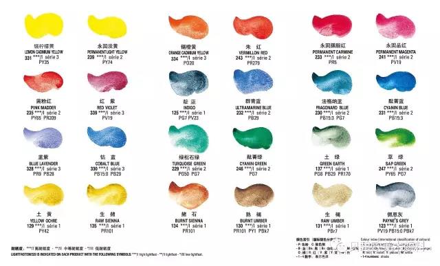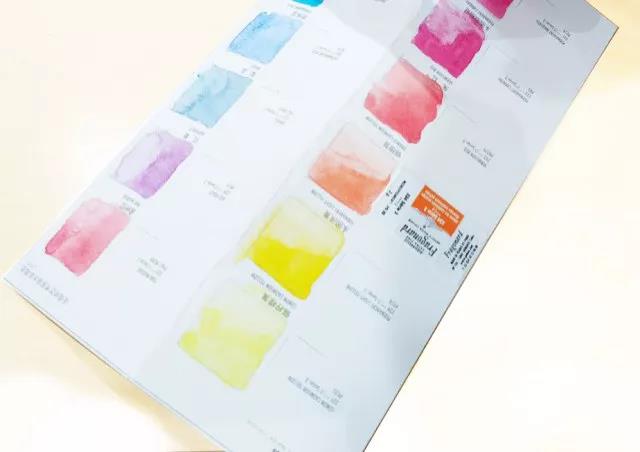 色卡采用质量上乘的进口德国哈内姆勒Leonardo莱昂纳多水彩纸 300gsm。每个色块标记好了颜色的色号和名称,艺术家可以将水彩块上的标签贴纸撕下,贴在色块旁边作标记,方便绘制自己的个人专属手绘色卡。