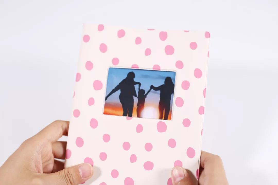 翻盖内侧的PVC收纳袋上印有英文装饰文字,放入照片后即呈现出相册般的效果。