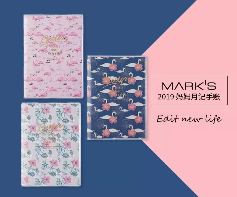 Part1:天鹅、老虎、火烈鸟等热门动物花纹与烫金文字的人气组合封面。火烈鸟款封面在2019年设计款中十分受欢迎,三种不同的元素带你感受不同的风情。火烈鸟充满热带风情,天鹅元素优雅宁静,老虎与花丛形成反差美。透明PVC封套印有“Better Things are coming”英文语句。用MARK'S妈妈手帐记录孩子的每一个成长变化。