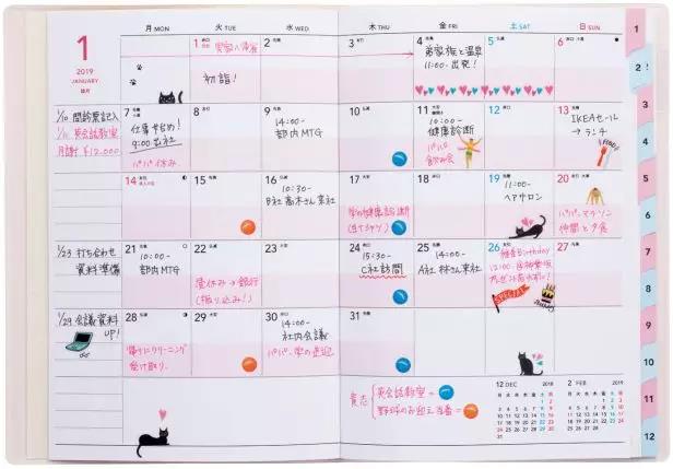 月记页的设计小细节可以说是非常之多!每一天用色块分出了上下两部分,可以分别记录家庭与个人、私事与公事等不同的项目,一目了然。可配合贴纸、记号标签等将孩子的学习活动、预定事项等进行标记和提醒。日期栏标注「每日吉凶」和「二十四节气」,便于妈妈安排季节性活动和孩子的活动。页面左侧为点线备忘栏,可记录待办事项或每周预约活动。页面下方留白,方便自由记录。右下角设有便利的月份索引标签。方便对比前后月份,省去很多翻页的时间。