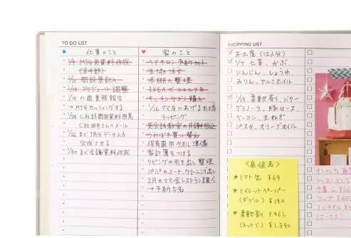 每月任务管理的左页为待办事项清单,右页为购物清单。待办事项清单是左右两列并排的版式,方便区分个人与家庭、公事与私事。两列勾选式的购物清单空间充足,可搭配图片和便签灵活使用。