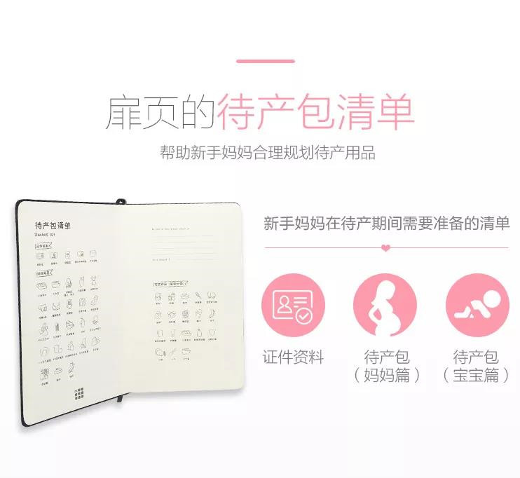 待产包是每个妈妈的必备,而笔记本的扉页就是按照资料证件、宝宝篇、妈妈篇三部分的待产包清单。