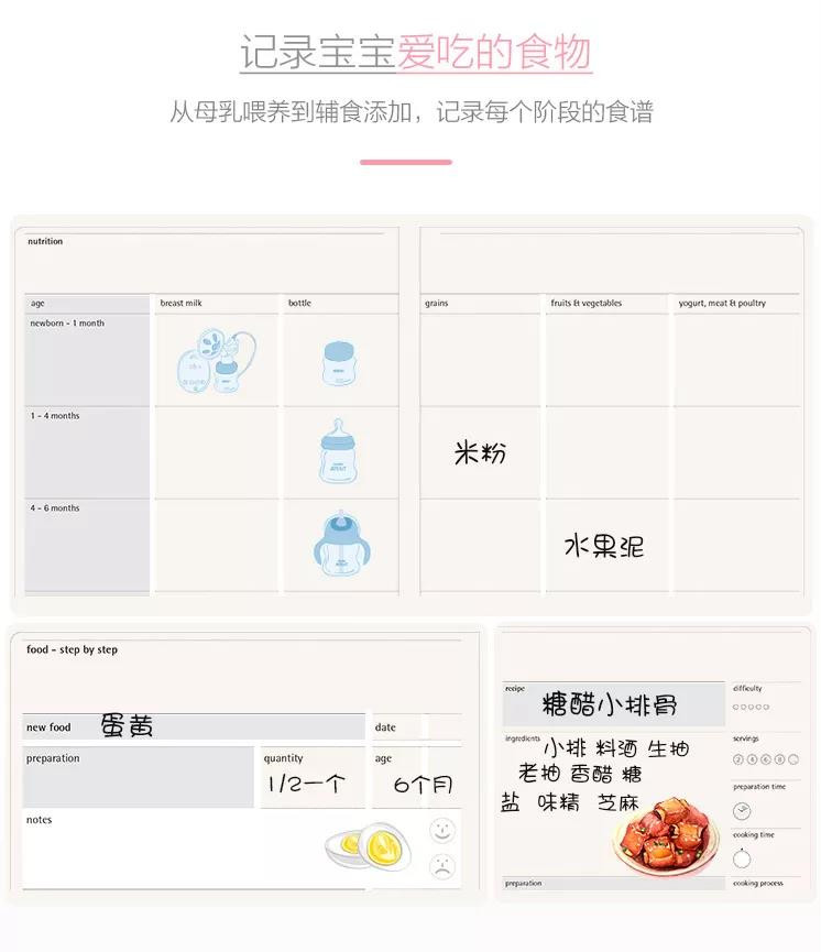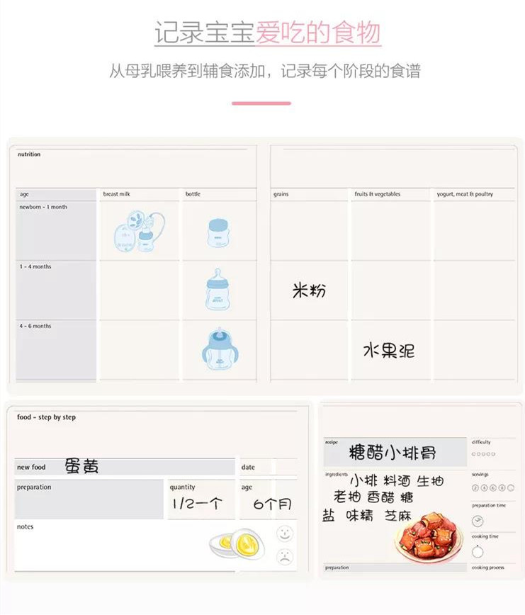 即使宝宝开始吃辅食,记录的好习惯也能让妈妈轻松知道宝贝的口味,抓住宝贝的胃不再困难。