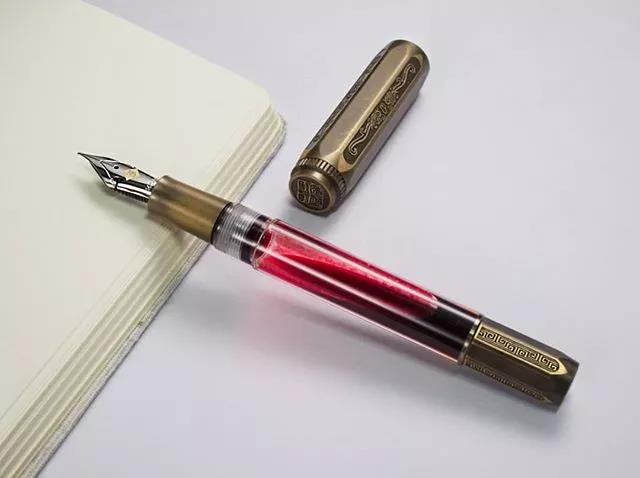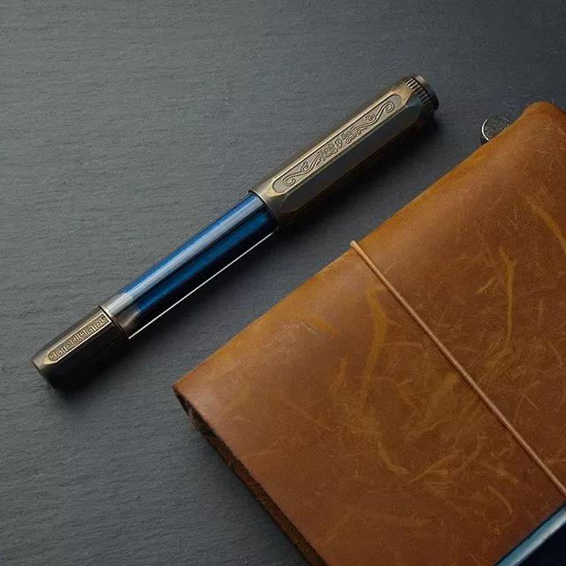 笔帽和笔尾都是青铜材质,笔杆中间则是透明树脂材料,可以最大程度的展现出彩墨的颜色。