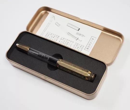 钢笔被装在一个铁盒子里,复古的金属感和笔盒里的青铜钢笔很搭。