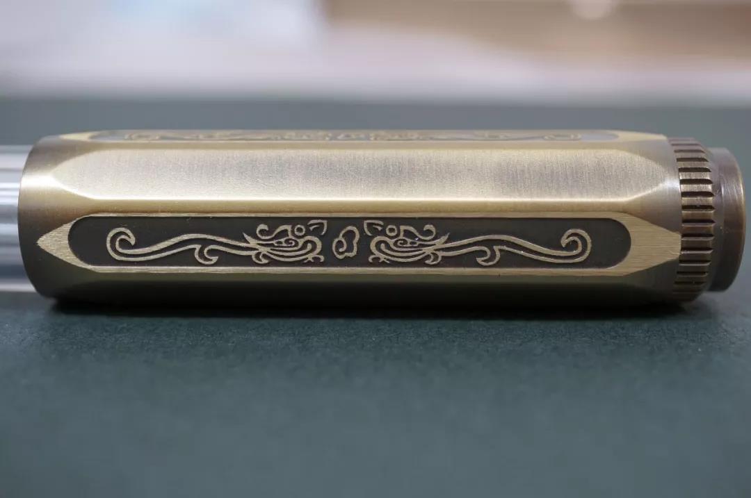笔帽采用了八角造型的设计,防止放置钢笔的时候会不小心滚落。笔帽和笔尾的侧边,都雕刻着神秘的图腾纹路。