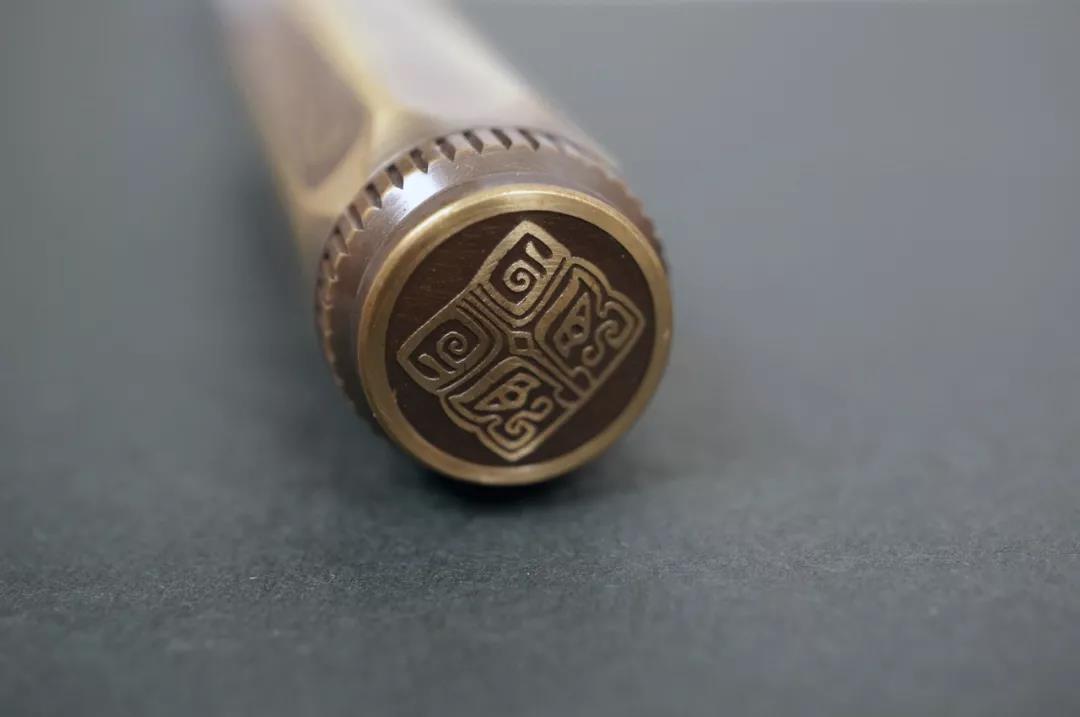 特别值得一提的是,笔顶的图案是饕餮,饕餮纹也是古代青铜器上比较常见的花纹。