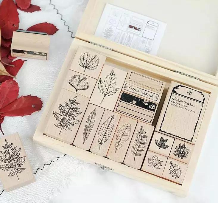 一盒16枚惊喜数量,包含12种树叶与4款标本框印章。