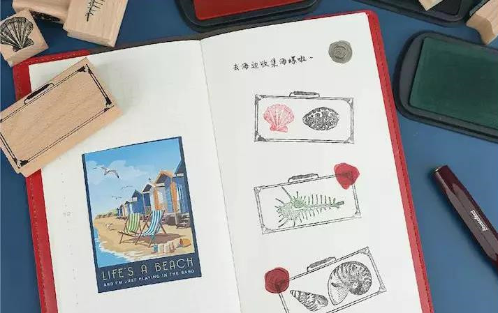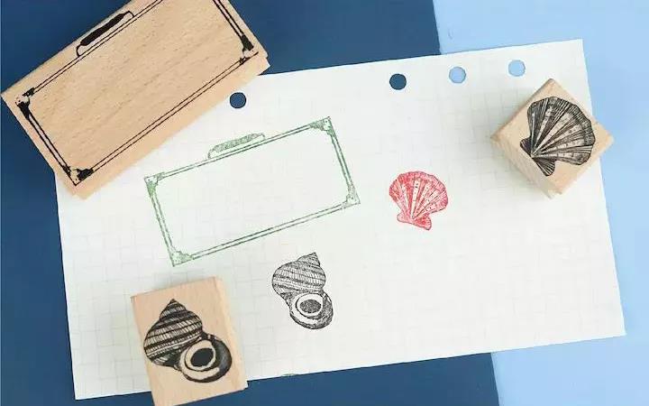 1款复古感满满的手提箱印章,留白处正好是贝壳的尺寸,精致小物随便“装”。