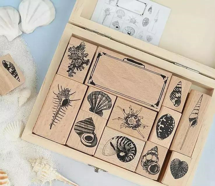 一盒12枚刻画超精细的高颜值印章,包含11种贝壳与1款标本箱。