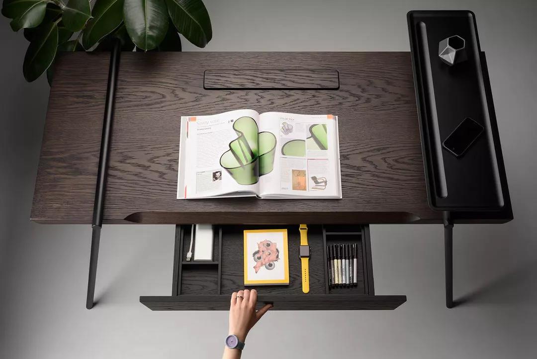 DUOO 剔除了任何不必要的装饰,仅为专心工作或是写作留存了一个干净、简洁的空间。尽管桌面采用简约设计,但它配备了贴心的小隔间来管理用户的电缆,以及收纳办公用品的抽屉和高架以容纳额外的装备。
