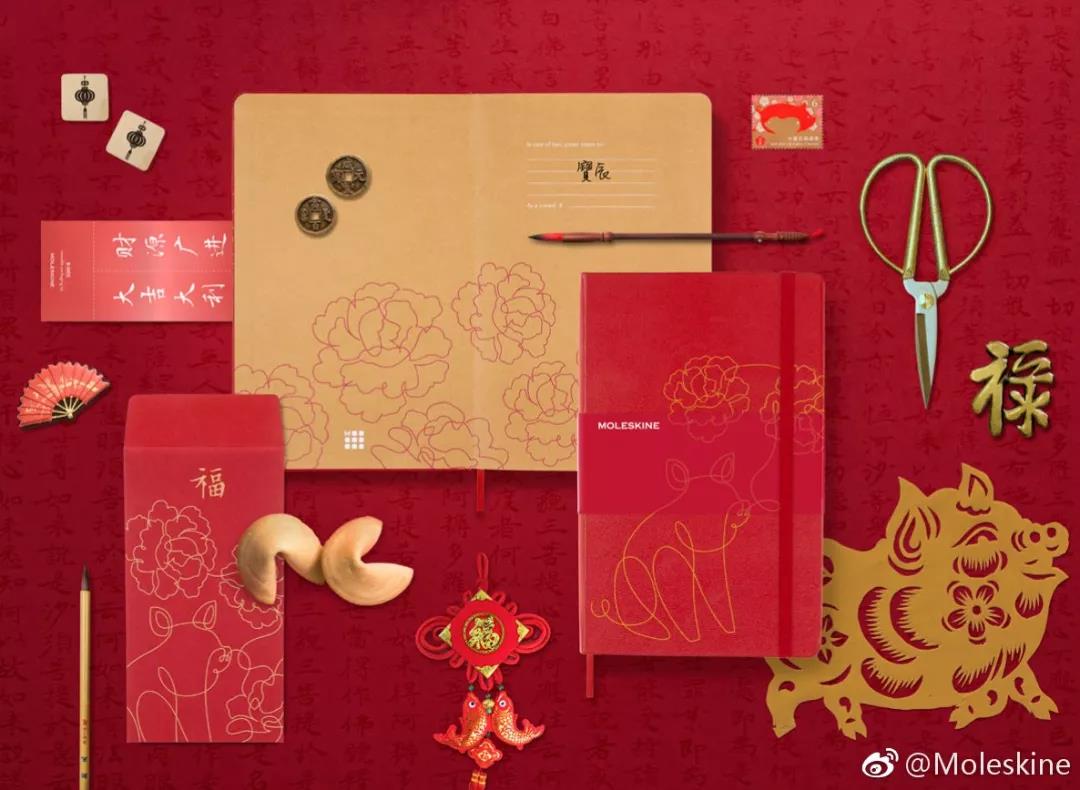 Moleskine可能意识到中国消费者喜欢红红火火的元素,所以在新年到来之际,特别推出了这款笔记本。猩红和琥珀黄配色,牡丹、金猪、锦鲤、荷塘,将浓郁年味和传统中国风元素跃然于封面上,一笔勾勒出圆满一年的开始,带来美好寓意。