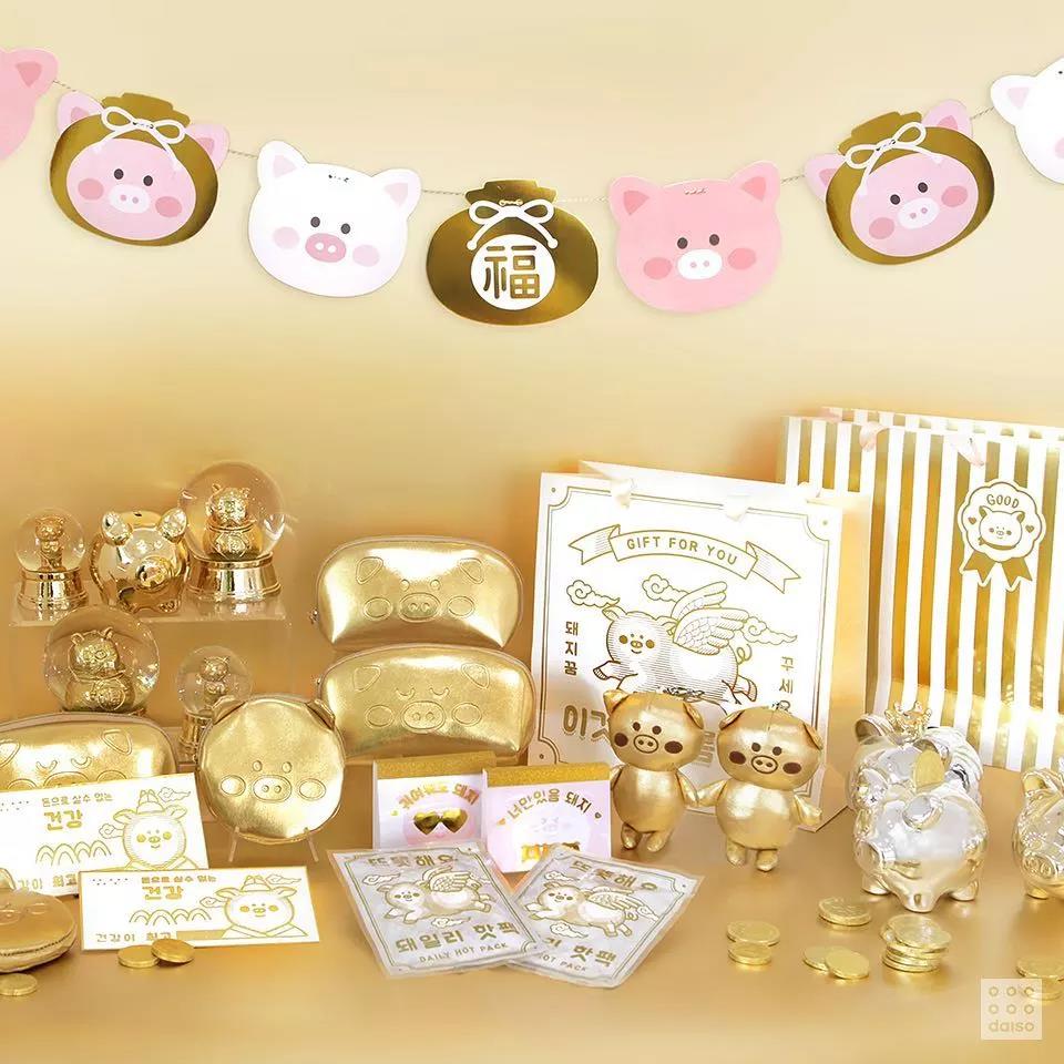 韩国大创出新品的频率比时装品牌还快,为了配合“猪年”,韩国大创就以“2019年黄金猪,不管做任何事都可以”为主题口号,采用韩文“能行”和“猪”的谐音发音 (돼지),分别推出可爱的粉红猪猪系列,以及寓意“黄金满屋”的黄金猪猪系列,产品囊括了:本册、日历、钱包、数据线等各种居家用品。