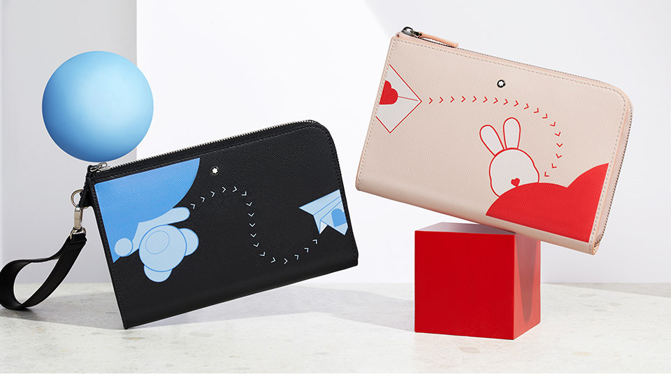 礼盒分别为“为他倾情”及“为她倾心”两个系列,男士款手拿包上有纸飞机和信封图案点缀在万宝龙匠心系列特有的十字纹皮革上,女士款手拿包为粉色甜心兔图案。简洁而生动的图案,表达了萌趣而又长久的甜蜜守候。