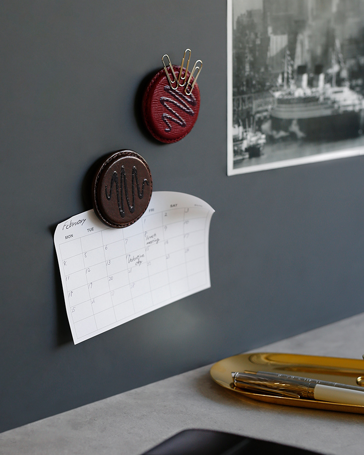 文具套组以三种巧克力名称来命名,包括:Bushe(便条纸收纳夹)、Pare(圆形磁夹)、Ganache(纸镇)。通过手工艺人的打造,将皮革的特性与色泽巧妙注入到设计与包装中,以模拟三种不同巧克力的风味口感,令人爱不释手。